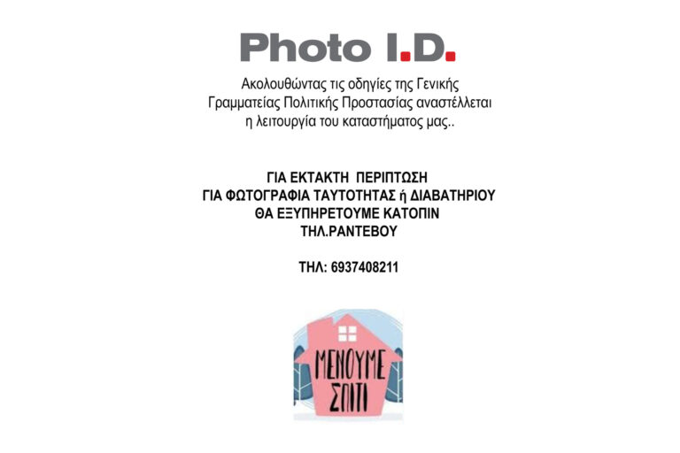 Τα καταστήματα Photo I.D. προσωρινά θα λειτουργούν από 08:00 εως 14:30 Δευτέρα-Παρασκευή Τετάρτη 08:00-20:00 Σαββάτο 08:30-14:00 Για οποιαδήποτε έκτακτη ανάγκη εκτός ωραρίου λειτουργίας μην διστάσετε να επικοινωνήσετε μαζί μας.