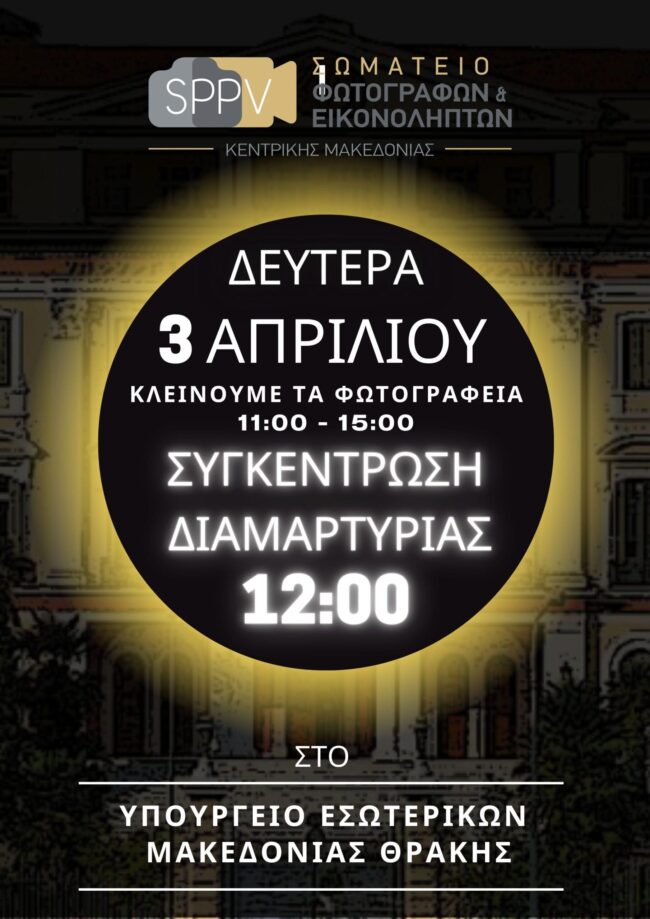 Σήμερα, Δευτέρα 3 Απριλίου, το Σωματείο Φωτογράφων και Εικονοληπτών Κεντρικής Μακεδονίας, η Ένωση Καλλιτεχνών Φωτογράφων ΚεντροΔυτικής Μακεδονίας, το Σωματείο Φωτογράφων Νομού Καβάλας και το Σωματείο Επαγγελματιών Φωτογράφων Ν. Ξάνθης “Κύκλωψ”, μέλη της Πανελλήνιας Ομοσπονδίας Φωτογράφων, μετά από απόφαση της Γενικής Συνέλευσης της Ομοσπονδίας, πραγματοποίησαν συγκέντρωση διαμαρτυρίας στο Υπουργείο Εσωτερικών (τομέας Μακεδονίας – Θράκης) της Θεσσαλονίκης. Με την μαζική τους συμμετοχή οι επαγγελματίες φωτογράφοι…